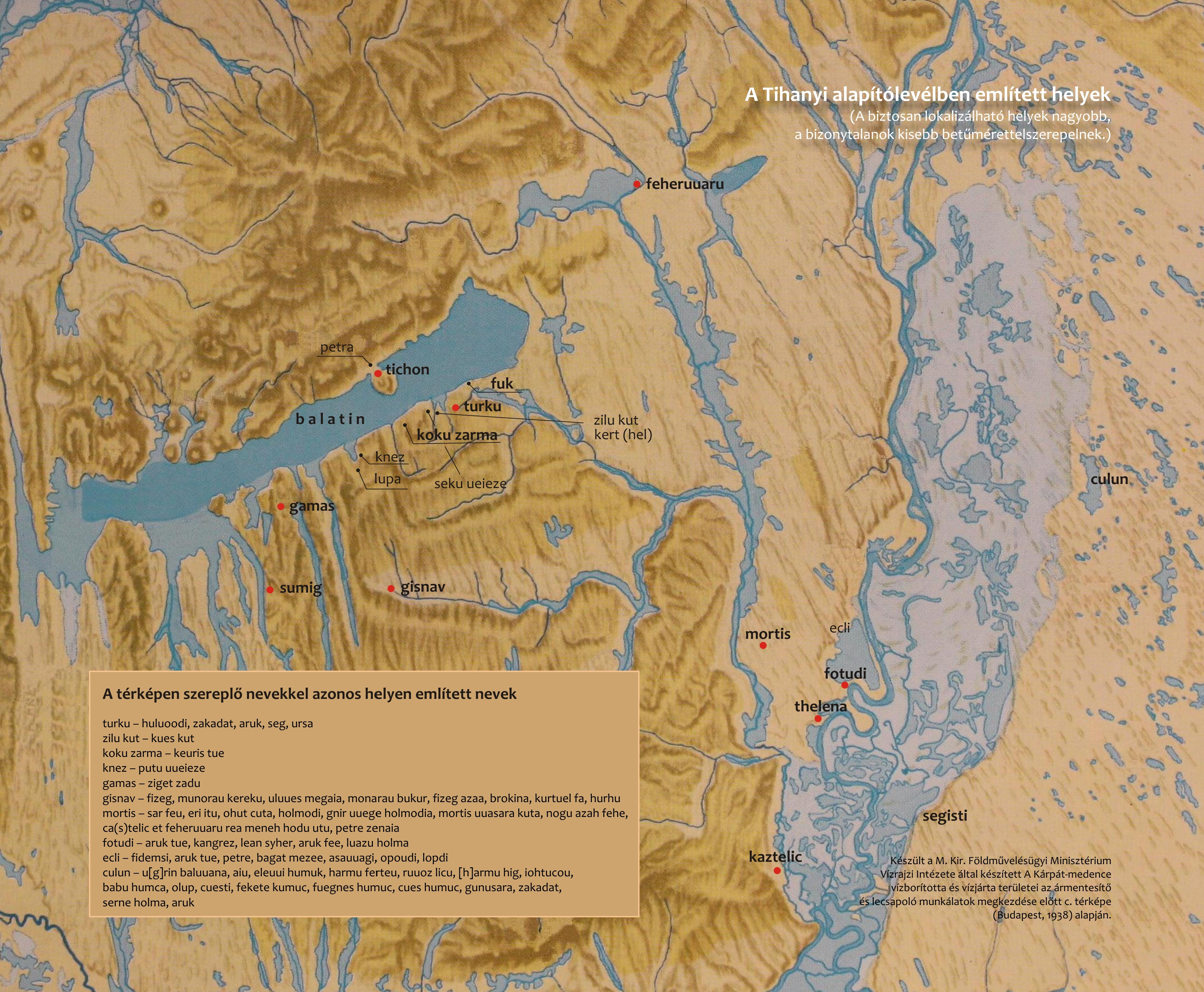 Az első eredetiben fennmaradt hiteles magyarországi oklevél a Tihanyi alapítólevél (TA), amelyet 1055-ben adott ki I. András király. Ennek tanúsága szerint az uralkodó Tihanyban bencés apátságot alapított, s az apátságnak birtokokat adományozott. A birtokok több birtoktestben, meglehetősen szétszórtan feküdtek, Tihany mellett főleg a Balaton déli partján hosszan elnyúlóan és kissé távolabb Somogy, továbbá Tolna vármegyében, sőt a Dunától keletre is. (A birtokok elhelyezkedéséről itt tájékozódhat.)