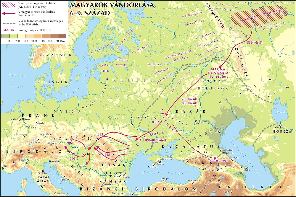 Az e térségben tartózkodó, főképpen törökségi nyelveket beszélő, nomadizáló népek vándorlási folyamatának részeként az 5. századot követően a magyarok folyamatosan mozogtak nyugat felé, és 895–896 körül végül elfoglalták későbbi lakóhelyüket, a Kárpát-medencét. E fél évezrednyi időszakból a Kaukázustól és a Fekete-tengertől északra fekvő térségekben a magyarságnak lényegében nem maradtak fenn nyelvi nyomai.
