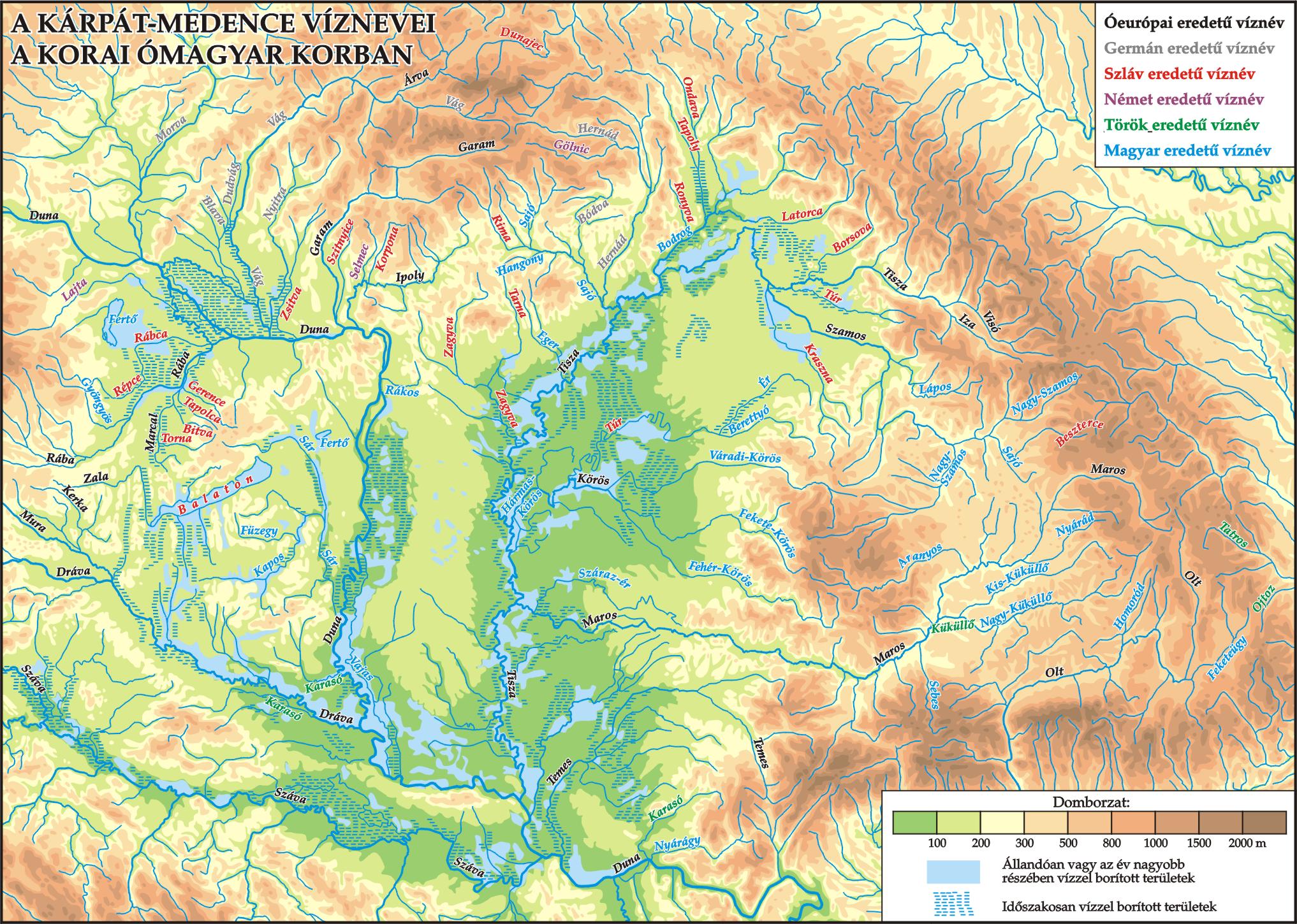 (A Kárpát-medence vízneveinek etimológiai rétegei láthatók ezen a térképen.)