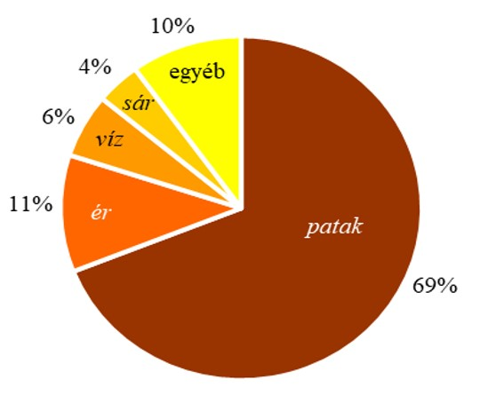 A korai ómagyar kor vízneveit tanulmányozva azt tapasztalhatjuk, hogy az átvizsgált összes víznév csaknem felében szerepel valamilyen vízrajzi köznév. Ezeknek a vízrajzi közneveknek a megoszlása azonban nagyon egyenetlen: a nevek csaknem 70%-ában a patak szerepel, ezt követi az ér, a víz és a sár, ezek együttesen is alig több mint 20%-ot tesznek ki, s a fennmaradó 8 köznév osztozik a további 10%-on.