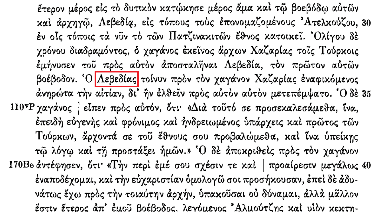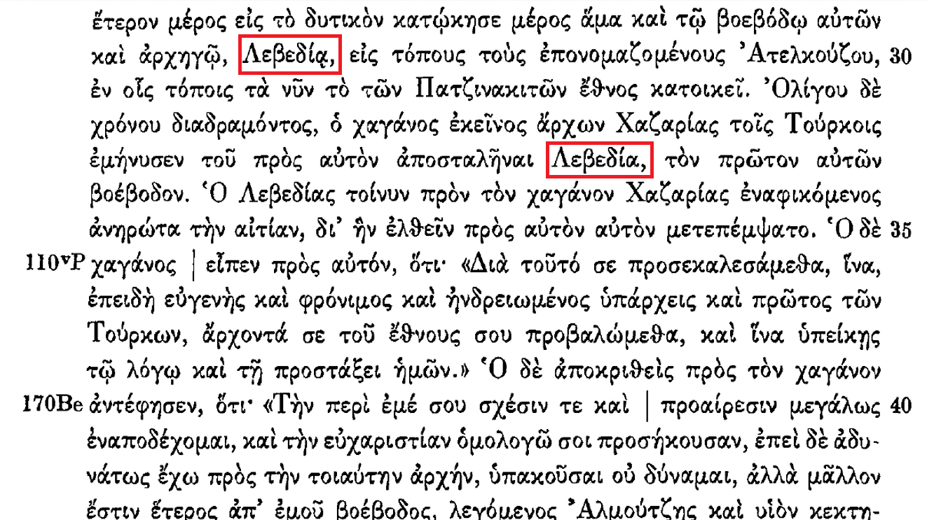 A magyarok a Λεβεδία [Lëβedi] nevű helyről elköltözve az Ατελκούξου [Etëlküzü] nevű területre érkeztek.