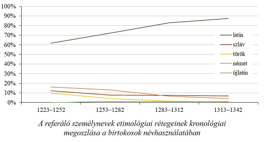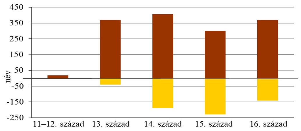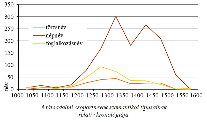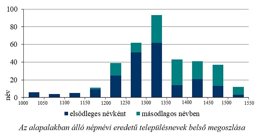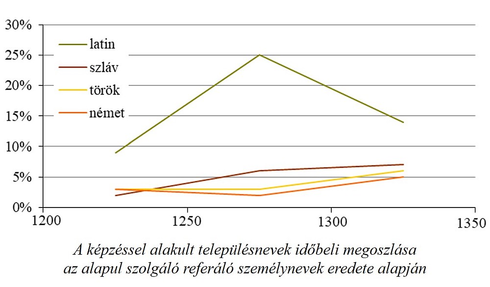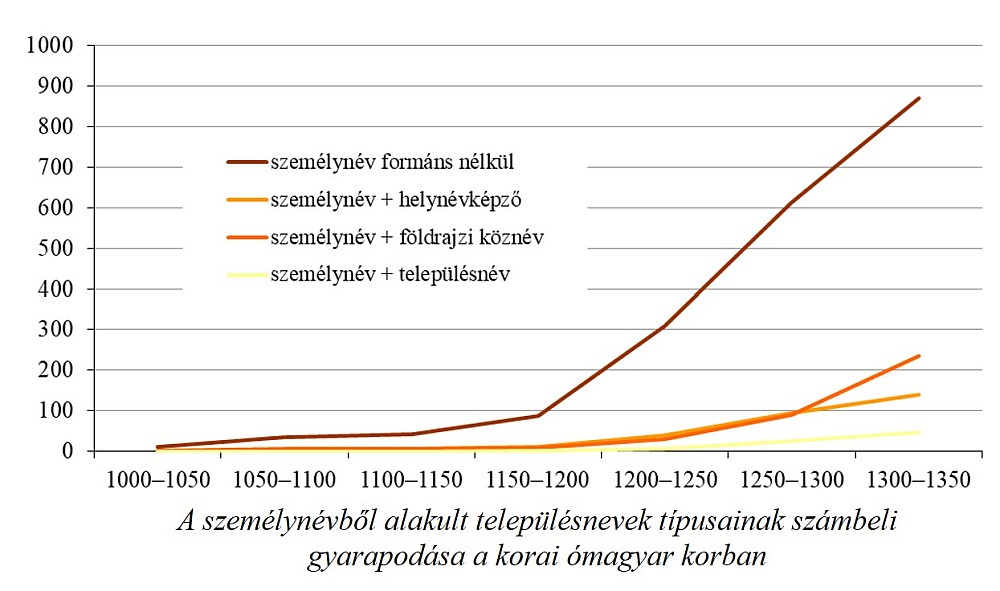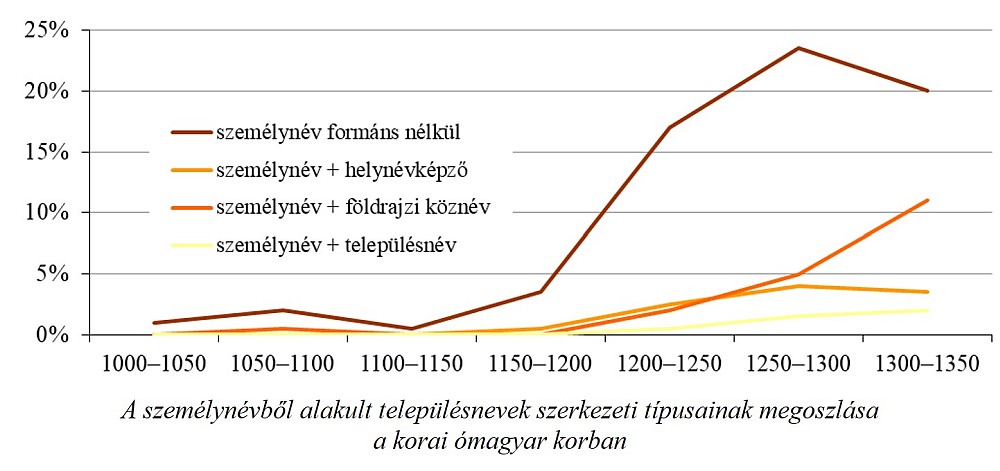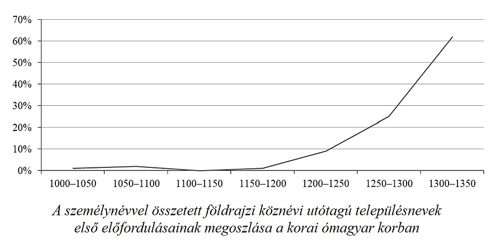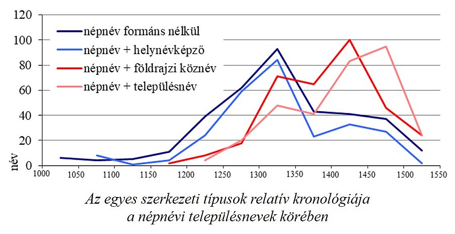 Az újabb fordulópontot aztán a 13. század vége, 14. század eleje hozza meg, amikor is a személynévből formáns nélkül alakult és a személynévből összetétellel (földrajzi köznévvel) alakult településnevek görbéje ellentétes irányt vesz: az összetett névstruktúra nagyfokú növekedést, az egyrészes, metonimikus névszerkezet pedig jelentős csökkenést mutat.