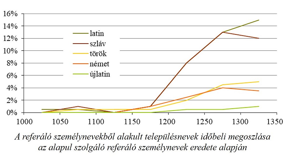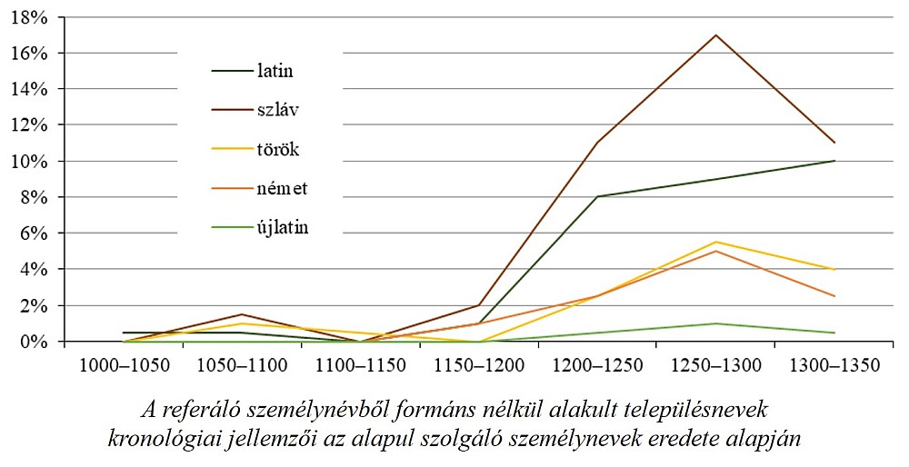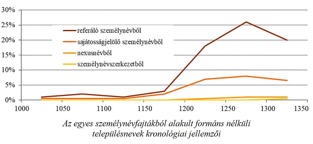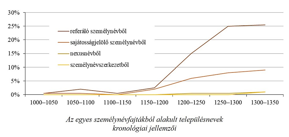 A személynévből alakult településnevek különböző névszerkezeti típusainak relatív kronológiájáról a következőket mondhatjuk. (A kronológiai ábrát itt tekintheti meg. Az ábrán a teljes elemzett névállományt vettük 100%-nak.)