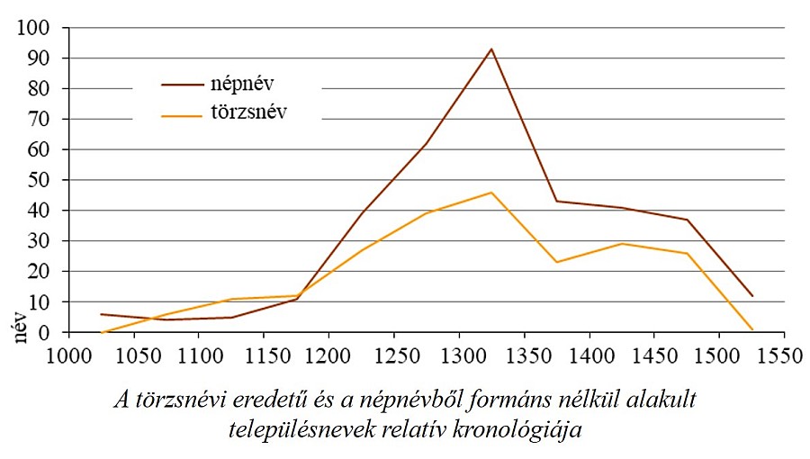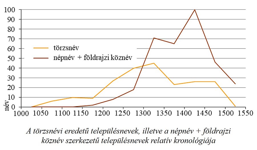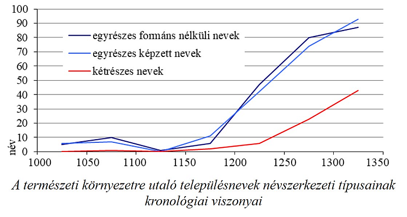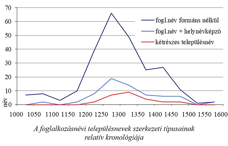 Ez a kronológiai ábra a névmodellek között ez idő tájt bekövetkezett elmozdulásokra világít rá. Mivel azonban a megrajzolásakor a településneveknek csupán a legkorábbi adataira voltunk tekintettel, és a továbbiakra nem (mivel a célunk az volt, hogy a produktivitásban történő változásokat regisztráljuk), a görbék nem adnak reális képet az egyes szerkezeti típusokba sorolható neveknek