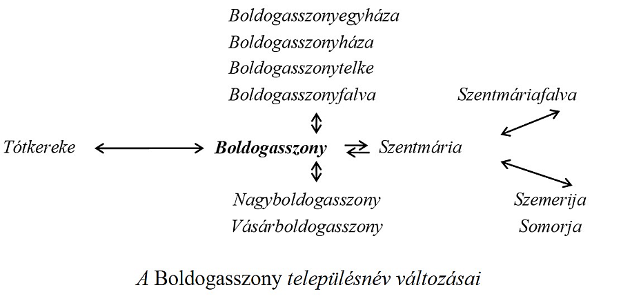 A szerkezeti változások szövevényes voltát, azaz a változási lehetőségek többirányúságát egy patrocíniumi településnév-csoport példáján szemléltetjük. A Boldogasszony ’szent asszony (azaz Szűz Mária)’ védőszentnévből 68 településnév alakult a Kárpát-medencében, s legtöbbjük strukturális felépítése módosult is az idők folyamán. Azokat a változásokat, amelyek a Boldogasszony településneveket érintették, ezen az ábrán mutatjuk be.